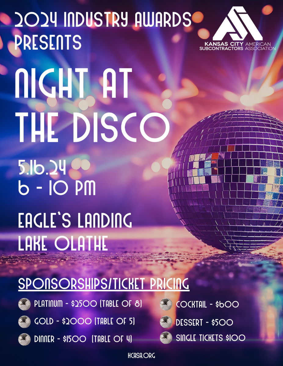 Join KCASA as we celebrate the BEST of the BEST in Kansas City commercial construction - with A Night At The Disco at Eagle's Landing Lake Olathe!