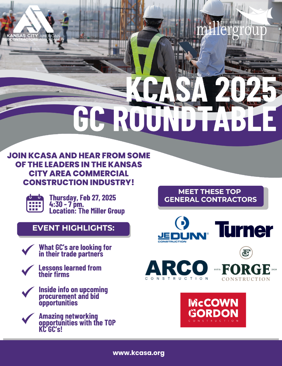 Ready to take your subcontracting business to the next level? Don't miss the KCASA General Contractor's Roundtable Event! Connect with top GCs, learn industry best practices, and discover new project opportunities. Register today!