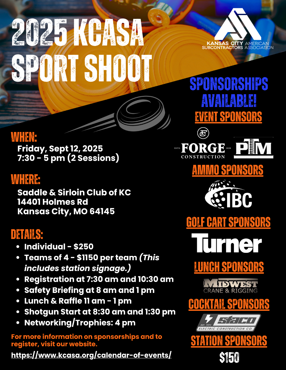 The 2025 Sporting Clay Shoot will be held at Saddle & Sirloin Club of KC in Kansas City, MO. Each team has (4) members. There will be 2 sessions - a morning session and an afternoon session. Each member of the team shoots 100 rounds at 12 stations. The object of the tournament is to have the highest number of broken clay targets for your team out of 400 targets. They have an open trap field for warm-up. The ammunition, golf carts, drinks, lunch, etc. are provided by KCASA as part of a team entry. NOTE: Please check the box below or email us at kcasa@kcasa.org and let us know if you are signing up for the morning session or afternoon session.