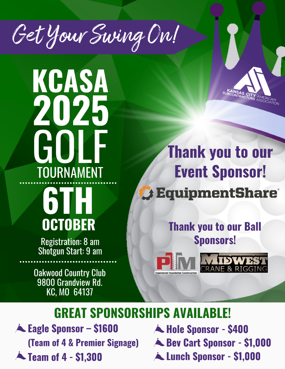 Join KCASA for our 2025 Annual Golf Tournament on Monday, October 6, 2025 at Oakwood Country Club. Part of funds raised will go towards creating a scholarship fund for JCCC's Construction Management Program.