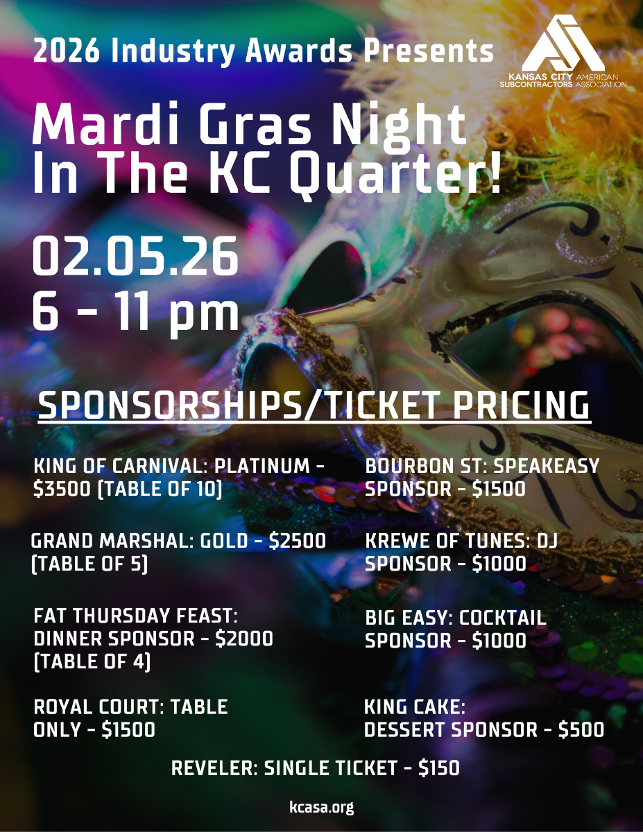Join KCASA as we celebrate the BEST of the BEST in Kansas City commercial construction - with a Mardi Gras themed fun!